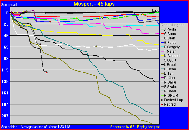 Vittoria! Vittoria! Nem mondanám, hogy minden a terv szerint alakult. Például az időmérőn csak nehezen sikerült hozni azt, ami a szabadedzésen még lazán jött. Ami persze borzasztó messze volt a betervezett 21.1-től, így sajnos csak az ötödik helyre voltam jó. Öröm az ürömben, hogy már időmérőn is egy egészséges szintre tankolva futottam, így legalább a verseny elején nem értek meglepetések az autó súlyát illetően. A rajt mondjuk nem sült el valami jól, Gabó is elém került, viszont voltam olyan szerencsés, hogy megúsztam a Gyula pörgő-forgó autójával való találkozást. A következő néhány körben Gabi mögött haladtam. Gyorsabb voltam a pálya egyes részein, de sajnos éppen azokon a részeken nem lehetett előzni. Ahol lehetett volna, ott meg kijött a Lotus-fölény. A hátul duruzsoló másik Lotus (Tomi) azért csak belehajtott egy szélárnyékos sprintbe, ami csúnyán be is néztem és kicsúsztam a bukkanót követő jobbosban. Kész szerencse, hogy nem értem hozzá senkihez... Összeszedtem magam a bokrokban (megúsztam a shift-r-t), majd kissé kedvetlenül beálltam a Gergő-Gabó páros mögé. Meglepve láttam, hogy Tomi mögöttem van -- gondolom ő is szállt utánam abban a jobbosban. Két-három kör telt így el négyesben, amikor újra bakiztam egyet -- máris a kiváló hetedik helyre estem vissza... Mögöttem a csapattársam. Már előre féltem mit kapok tőle a verseny után : D Aztán elől történt valami, Ricsi és Gabó pihent a hajtűben -- nyertem két helyet. Kicsit később Gergő hibázott Tomi előtt, majd Tomi is vétett egyet -- már harmadik voltam, és kezdtem pozitívan látni a világ dolgait. Lekapcsoltam a pribit és elkezdtem üldözni Gabit, mögöttem Gergő illetve később Gabó. Szépen felzárkóztam Gabira, de mielőtt igazán szorongatni kezdhettem volna, ismét eldobtam a vasat... Ha jól emlékszem a kettes kijáratánál csúsztam a bokrokba. Egy festett hajszállal Gabó előtt értem vissza az aszfaltra, aki ettől érezhetően felgyorsult, mert simán tapadt rám a következő 7-8 körben. Fel is értünk szépen Gabi mögé. Kb ekkor köröztük le Lacit, ami nekem első próbálkozásra nem sikerült valami fényesen: T3-ban a fűre sodródtam, Gabó természetesen elsuhant mellettem -- így ismét a negyedik helyen pislogtam, hogy mit is kellene tenni. A verseny utolsó harmadában-negyedében aztán elég koncentrált voltam, így nemcsak hogy a balszerencse került el, hanem még mákom is volt, ráadásul kétszer. Először is pont mire felzárkóztam Gabi és Gabó kettősére Convar hibázott(?) elől, és kialakult egy csinos kis négyes. Hét körrel a vége előtt volt köztünk 2-3 mp -- lásd mellékelt ábra. Aztán valahogy minden olyan egyszerű lett: Convar és Gabó kicsúsztak a Bukkanó Utáni Gonosz Jobbosban, Gabi megforgott T1-ben, én meg bekocogtam a célba. Kösz minden résztvevőnek! És grat mindenkinek, aki végigtolta a a bő egyórát!